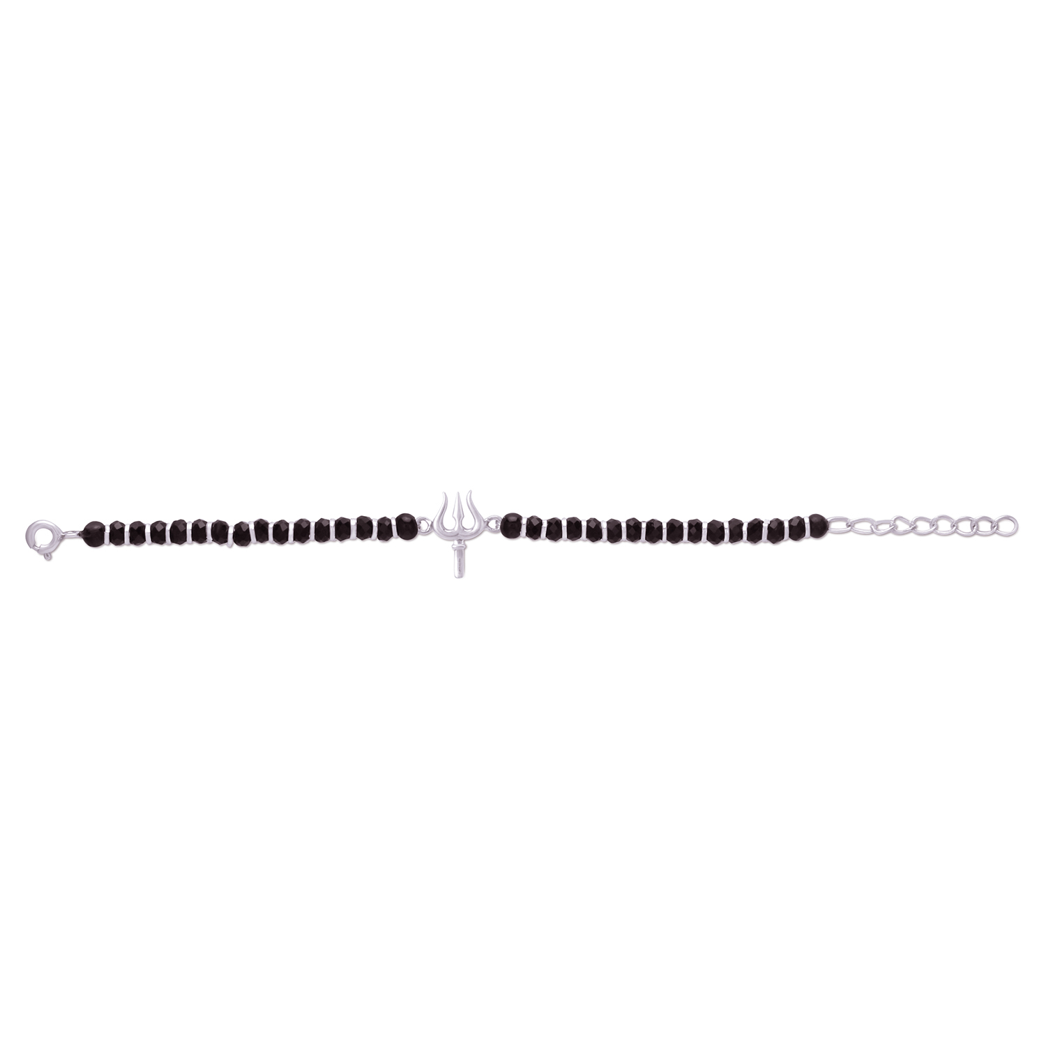 The bracelet features a fine silver Trishul charm at the center, joined by black beads and pure silver rings on each side. Made with pure silver, it is lightweight and easy for babies to wear.