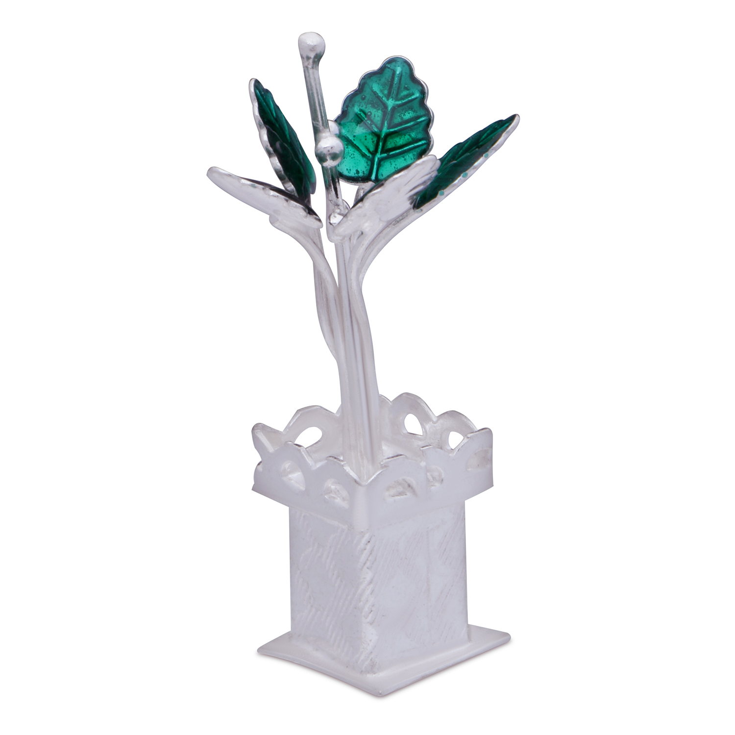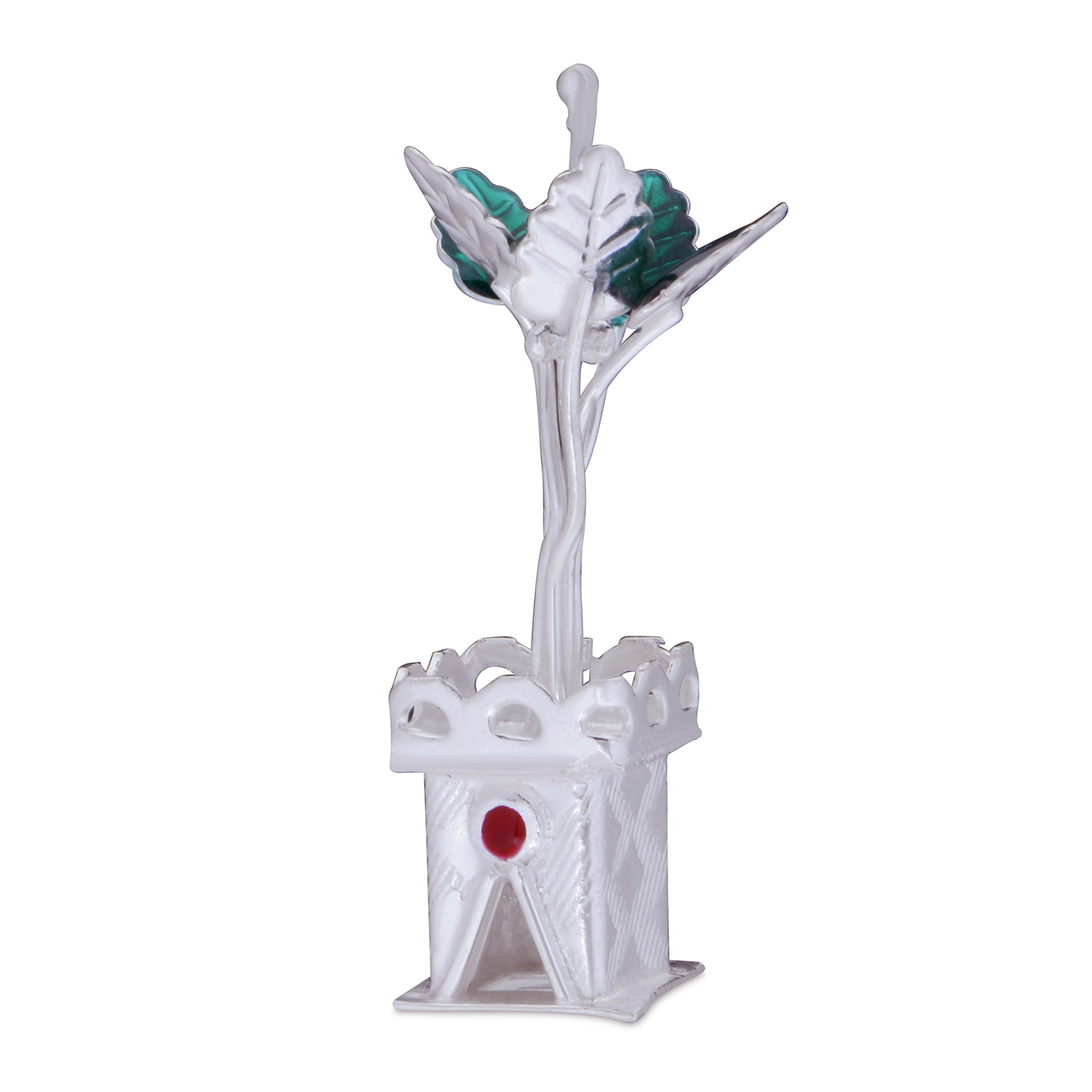 A replica of a real Tulsi Pot in Silver with Tulsi plant, Tulsi pot and even Tulsi flower. The design is very traditional and the leaves have green Meena work giving it a very divine look. It has a glossy finish.