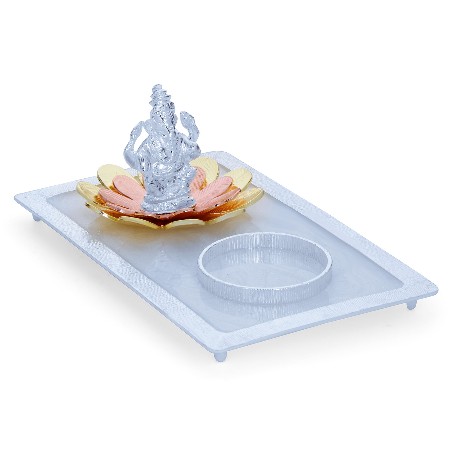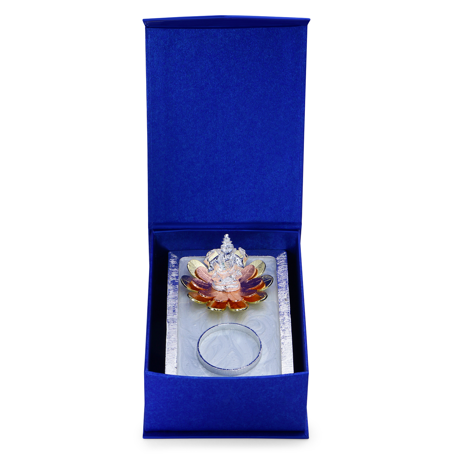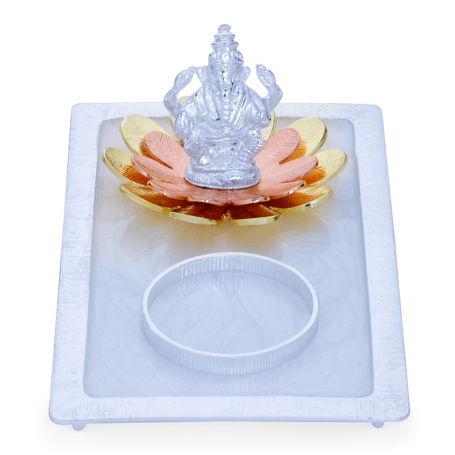 Enhance your spiritual space with this beautifully crafted Tea light holder. Featuring a finely detailed silver plated Ganesh idol seated gracefully on a dual-tone flower flower, this piece symbolizes wisdom, prosperity, and positivity. The rectangular base adds a modern and structured touch, making it suitable for both traditional and contemporary interiors. Designed with a dedicated circular space to hold a Tea light candle, it creates a serene and divine ambiance when lit. Ideal for pooja rooms, living spaces, office desks, festive decor, and special occasions like Diwali, Ganesh Chaturthi, and housewarming ceremonies. This decorative piece also makes a thoughtful return gift and spiritual present for loved ones.