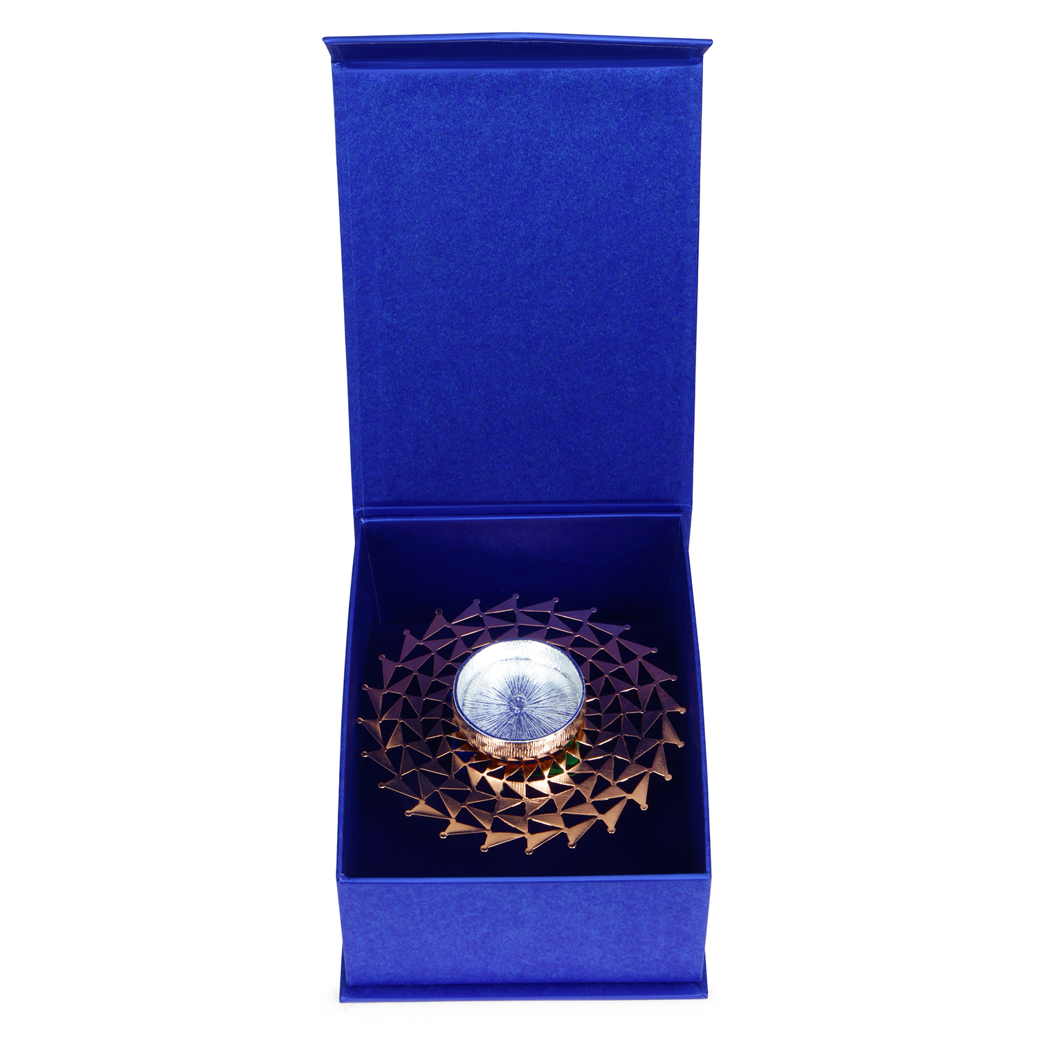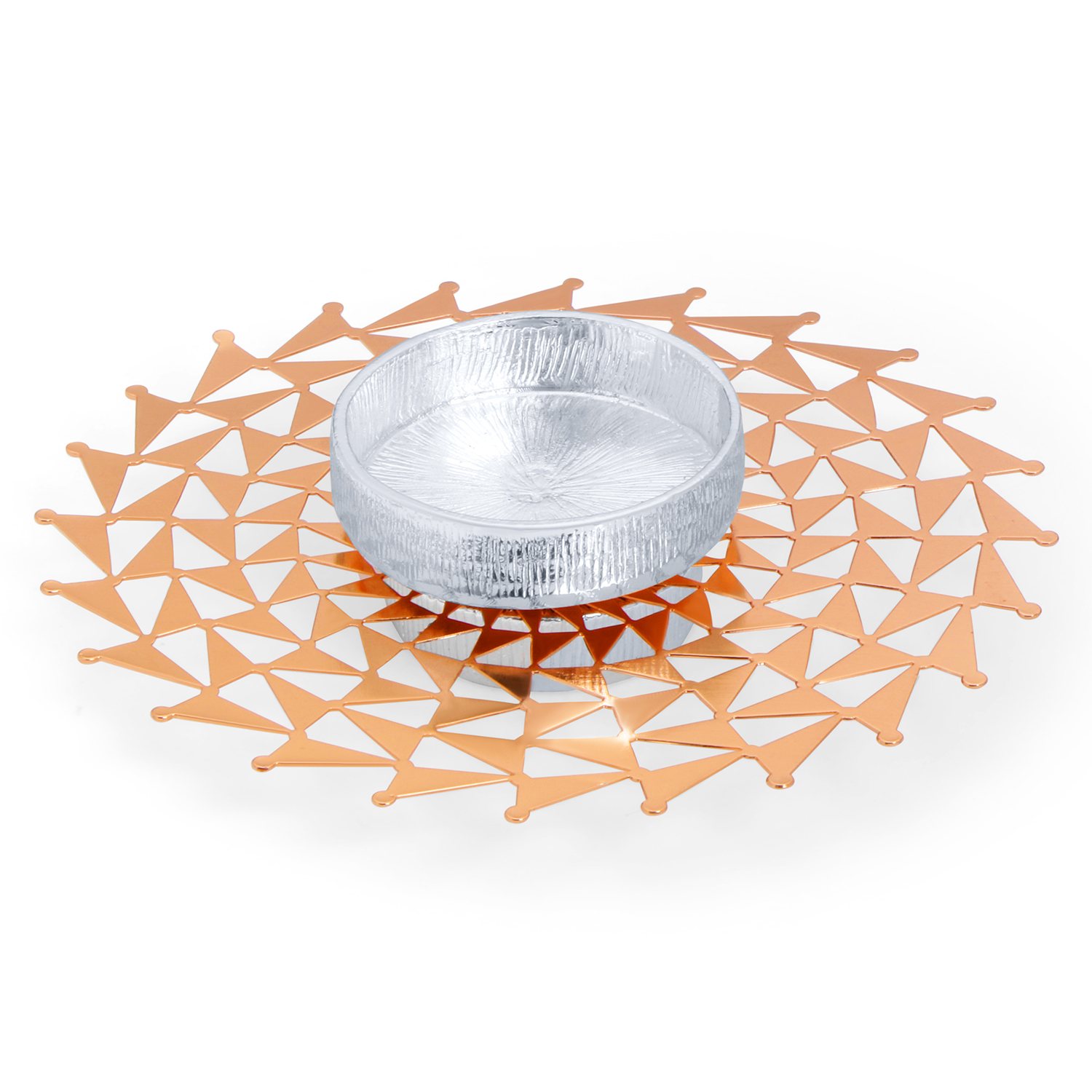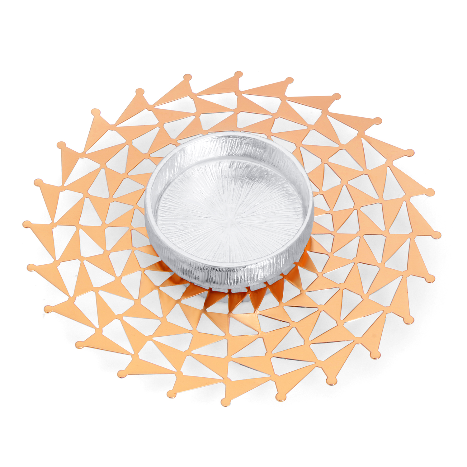 The design showcases a modern circular layout crafted with detailed geometric triangular cutwork in a radiant rose gold finish. The symmetrical pattern forms a delicate lattice structure that adds depth and elegance. At the center, a polished silver-toned tea light holder is neatly placed, creating a refined contrast against the warm rose gold base.