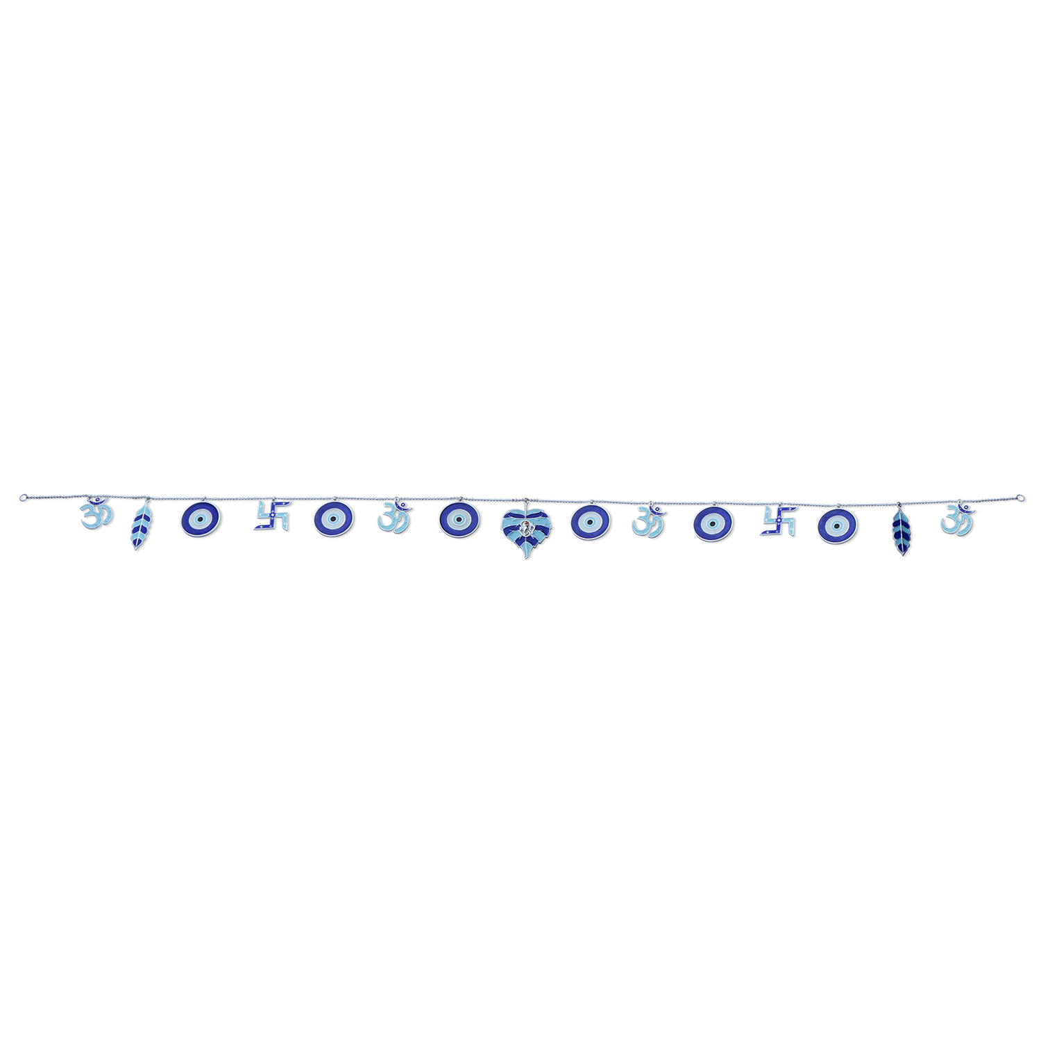 Enhance your home entrance with this beautifully crafted Toran, designed to blend spiritual symbolism with modern decorative appeal. Featuring multiple evil eye charms, Om symbols, Swastik motifs, feather accents, and a central heart-shaped evil eye pendant, this toran represents protection, prosperity, and positivity. The elegant plated finish adds a premium shine, making it suitable for festive occasions like Diwali, Navratri, housewarming ceremonies, and weddings, as well as everyday decor. The balanced alignment of charms across a sturdy chain ensures durability and easy hanging on doors, walls, or pooja room entrances.