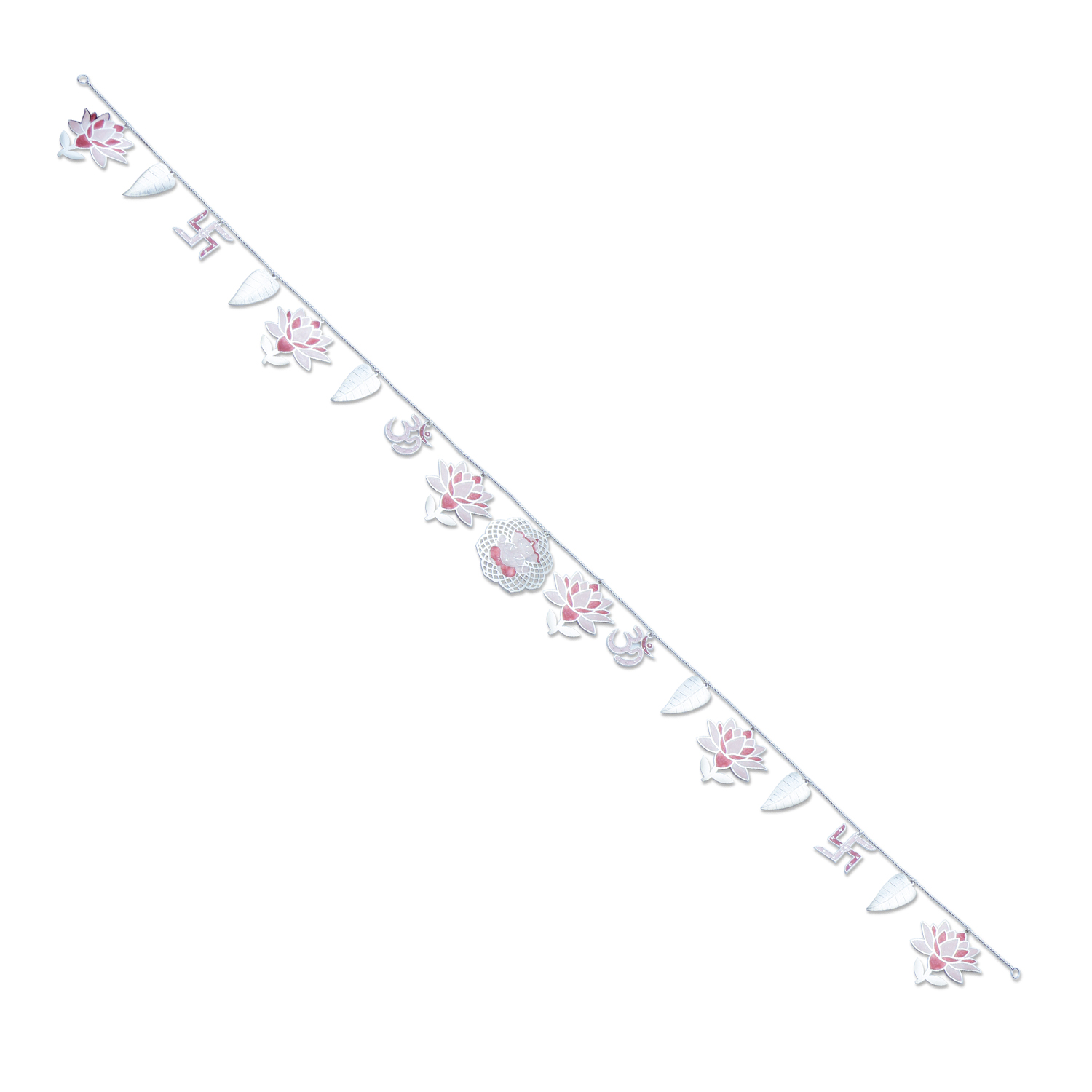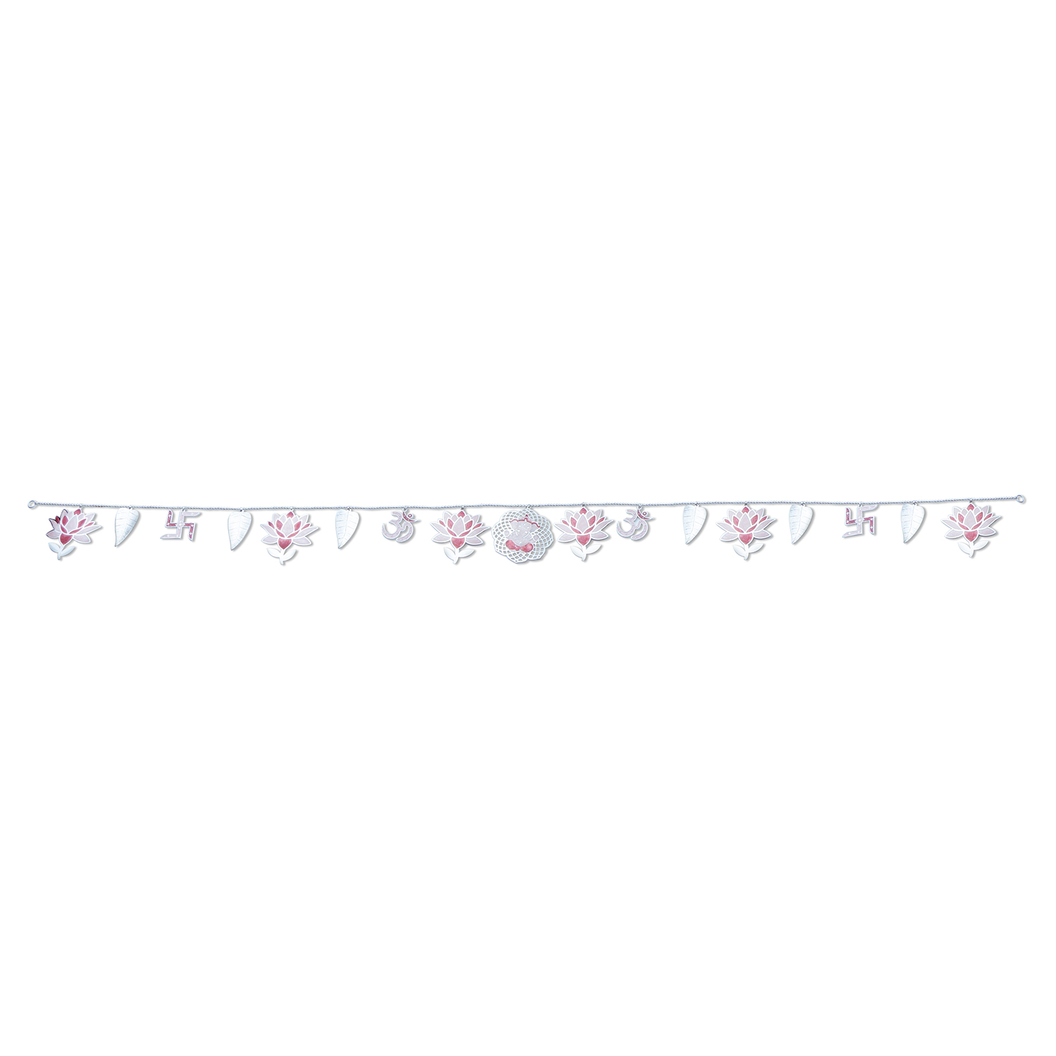 The toran showcases a symmetrical arrangement of lotus flowers, Om symbols, Swastik motifs and a central Ganesh design connected along a sleek plated chain. The lotus motifs are highlighted with soft pink accents, adding a subtle contrast to the polished silver-plated finish.